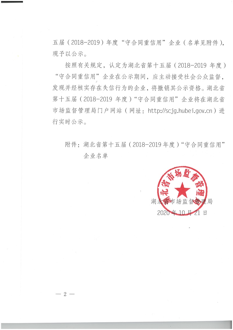 閱讀次數(shù):1434 發(fā)布時間:2020年11月25日公司被認(rèn)定為第十五屆(2018-2019年度)湖北省守合同重信用企業(yè)