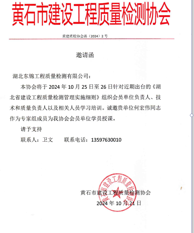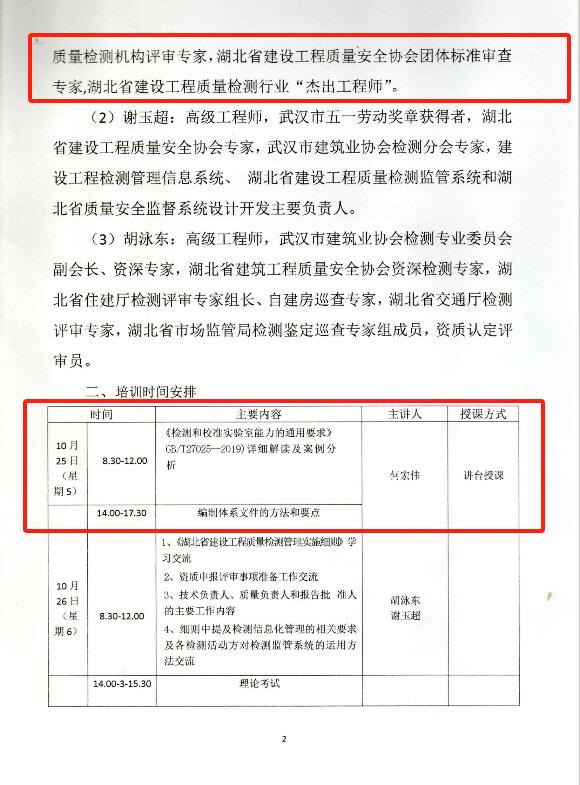 閱讀次數(shù):1106 發(fā)布時間:2024年10月22日公司總經(jīng)理何宏偉受黃石市建設工程質(zhì)量檢測協(xié)會邀請,于2024年10月25日-26日作為專家組成員為協(xié)會會員單位授課,授課內(nèi)容為:《檢測和校準實驗室能力的通用要求》GB/T27025- -2019) 詳細解讀及案例分析和編制體系文件的方法和要點。