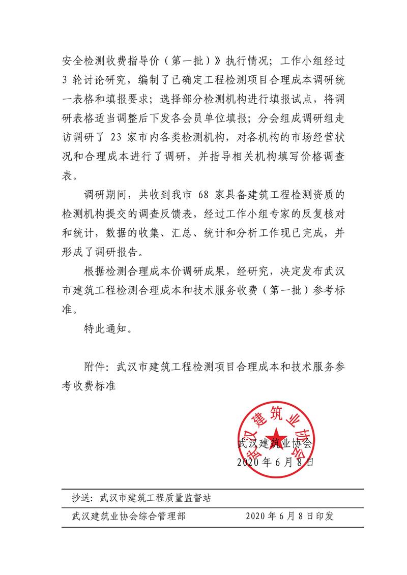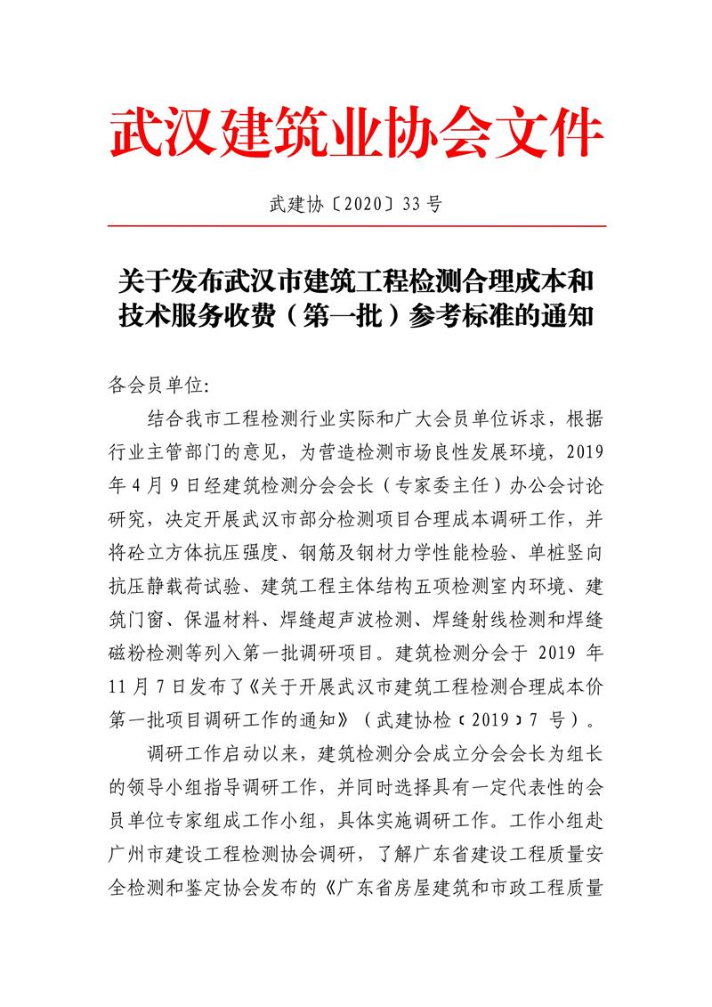 關(guān)于發(fā)布武漢市建筑工程檢測合理成本和技術(shù)服務(wù)收費(fèi)(第一批)參考標(biāo)準(zhǔn)的通知 武建協(xié) 〔2020 〕33號